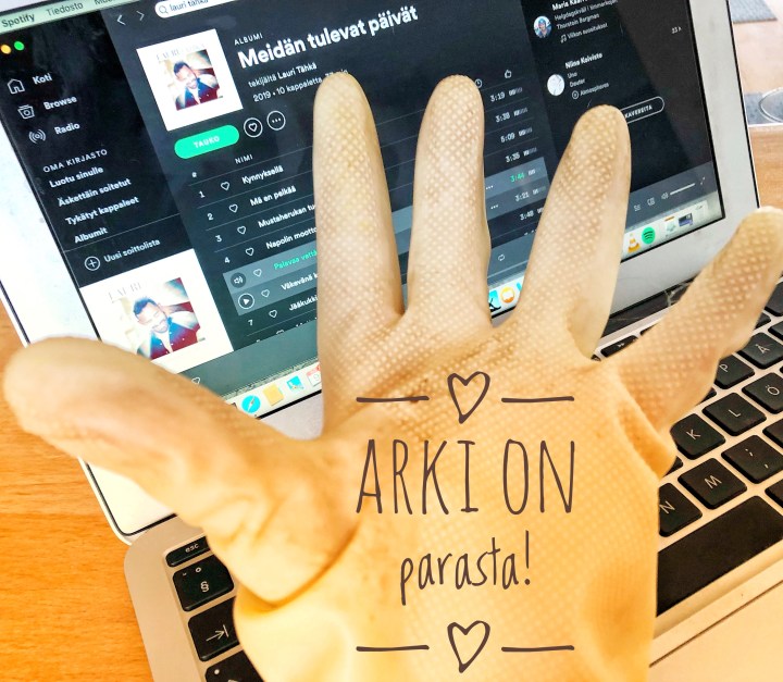 Jos arjesta ei osaa nauttia, voi olla syytä pohtia miksi. Kumihanskaperjantai ei välttämättä saa kaikkia ihan liekkeihin, mutta siivoaminenkin saa ihan uusia ulottuvuuksia kun ymmärtää ettei sekään ole itsestäänselvyys. Joku on niin sairas ettei pysty, toisella ei ole kotia mitä siivota, jollain ei käsiä mihin kumihanskoja laittaa.