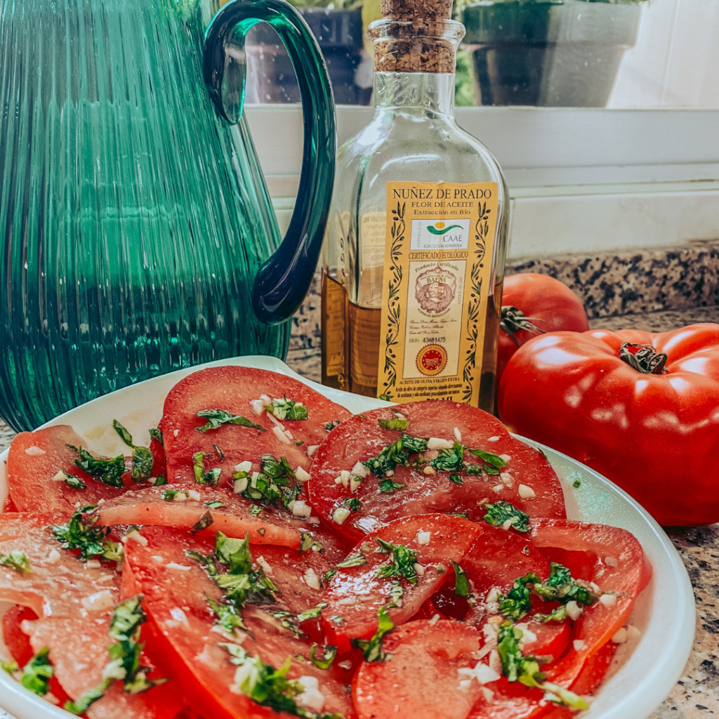 Tämän erittäin yksinkertaisen reseptin salaisuus on auringossa lämmenneet, kypsät tomaatit. Ne leikataan ohuehkoiksi siivuiksi, tosin monessa paikassa tomaatit on voitu leikata myös reilunkokoisiksi paloiksi.